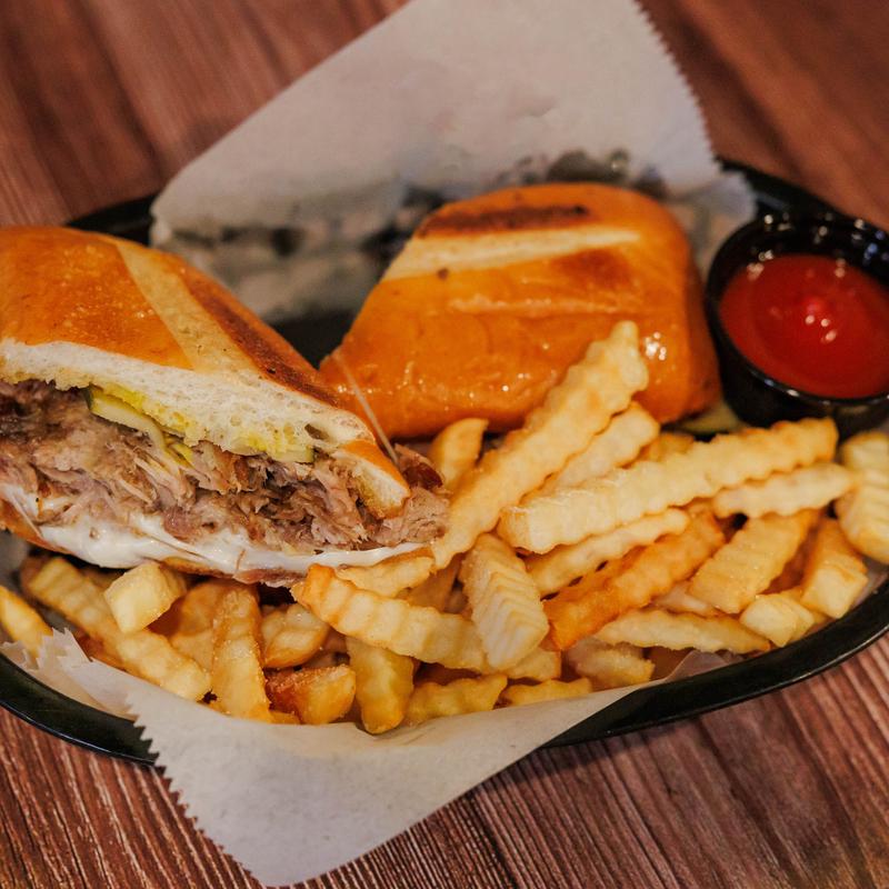 Roast pork, ham, Swiss cheese, pickles and mustard