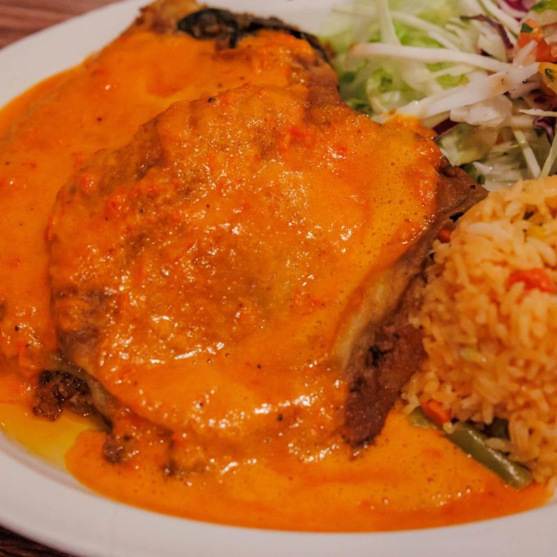 Two whole chili peppers stuffed with cheese, choice of shredded chicken or ground beef covered with poblano sauce