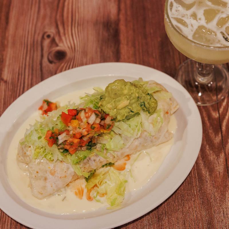 Large 12" burrito with your choice of protein, yellow rice with grilled onions, peppers and covered with cheese, topped with lettuce, pico de gallo and guacamole, ground beef, chicken, strips of beef or veggie