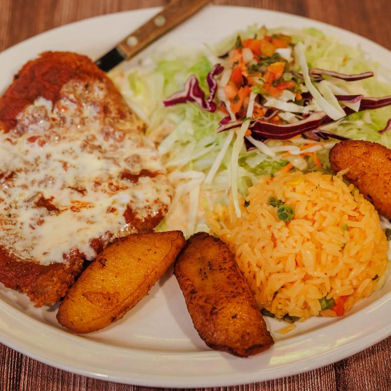 Fried green plantains, mashed with salt, garlic butter & salad. Your choice of protein & rice